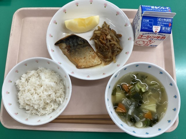 麦ご飯、わかめの味噌汁、鯖の味噌煮、五目金平、りんご、牛乳です。