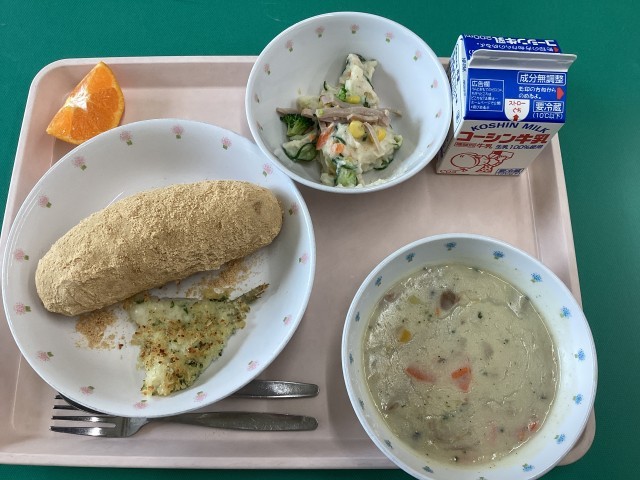 きなこ揚げパン、まろやかクリームスープ、キスのチーズ焼き、彩りポテトサラダ、ポンカン、牛乳です。