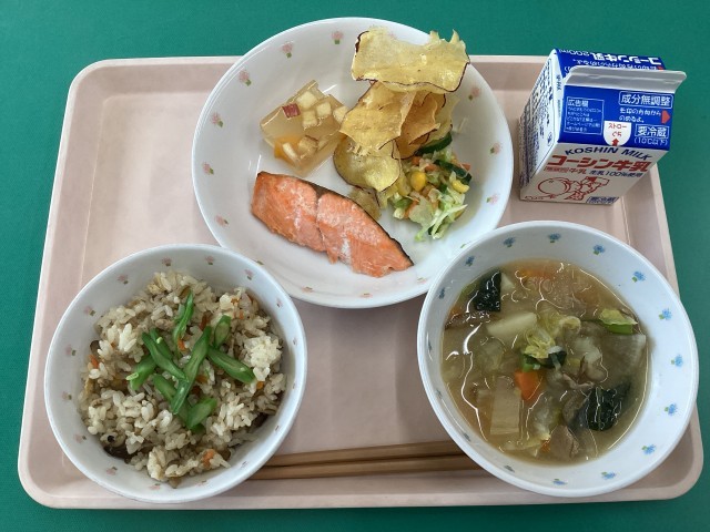 混ぜご飯、田舎汁、鮭の塩麹焼き、さつまいもチップサラダ、フルーツ寒天、牛乳です。