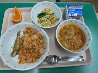 五目チャーハン、かに玉風卵焼き、ワンタンスープ、杏仁豆腐、牛乳です。