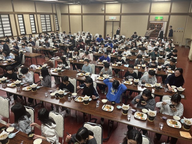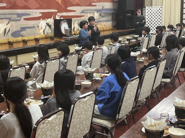 初日の夕食の時間です。たくさん遊んだので、みんなお腹が空いています。