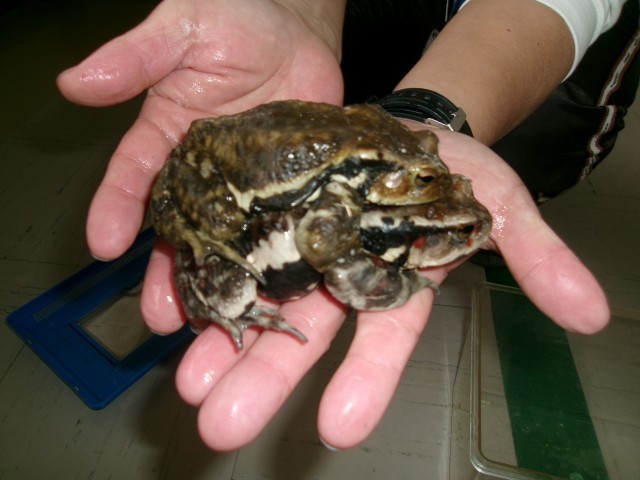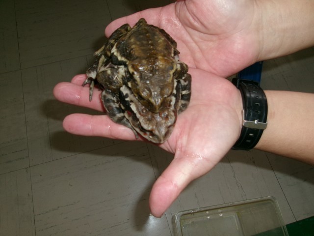 朝、東側のビオトープの近くで、教員が2匹のカエルを見つけました。とても大きいので、子供たちもびっくりすると思います。見せたときにどんな反応があるか楽しみです。