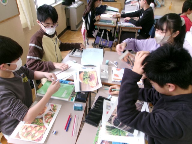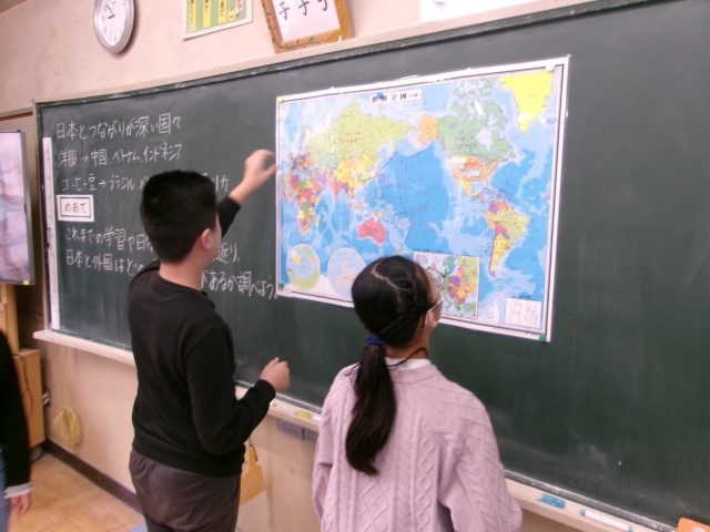 これまで社会科の学習や日常生活の中で知っていることを踏まえ、用意された写真を見てそれがどこの国のものか考えて、大きな地図にまとめました。「昔は近い国との交流が中心だった」と、大切なことに気付いていました。