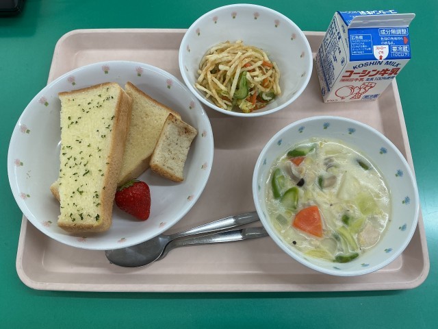 ガーリックトースト&シュガートースト、春野菜のシチュー、ジャガジャガサラダ、いちご、おまけのラスク、牛乳です。