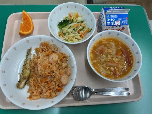 チキンライス、イタリアンスープ、花野菜サラダ、にぎすのパン粉焼き、なつみ、牛乳です。