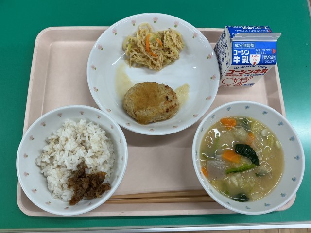 もち麦ご飯、あさりの時雨煮、具沢山味噌汁、えのきバーグ、野菜と切り干しの和物、牛乳です。