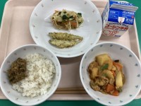 ちりめんじゃこと山椒を煮た佃煮を作り、ご飯にまぶしました。大人っぽい味付けだったのですがご飯美味しいねとよく食べてくれました。