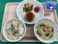じゃこ炒飯・中華野菜スープ・ツナ春巻き・オーギョーチー風ゼリー・牛乳です。