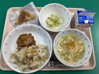 おなか元気ランチ:じゃこピラフ、とりのレモン風味あげ、もやしスープ、きな粉のスノーボールクッキー、牛乳(下の写真です)