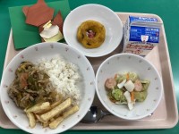 じゃこピラフ、牛乳、ポテトオムレツ、あさりのカリッとサラダ、肉団子スープです。
