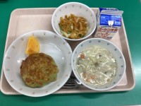 秋の吹き寄せごはん、牛乳、マスのさざれ焼き、じゃがいものきんぴら、けんちん汁、菊花みかん