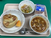麦ごはん、かつおの角煮、牛乳、お豆腐入り和風オムレツ、五目野菜炒め、じゃがもちみそ汁