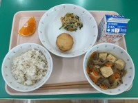 きび入りご飯、牛乳、しいらのゴママヨネーズ焼き、キャベツのからしあえ、ふわふわ豆腐汁、いもようかん