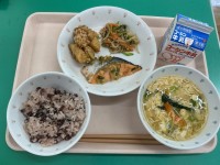 広島菜めし、牛乳、ワニのフライ、さつまいものレモン金平、のっぺい汁