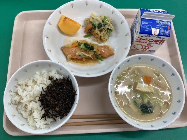 今日の献立麦ご飯、ひじきのふりかけ、豆乳味噌汁、鮭の味噌焼き野菜のせ、胡麻和え、...