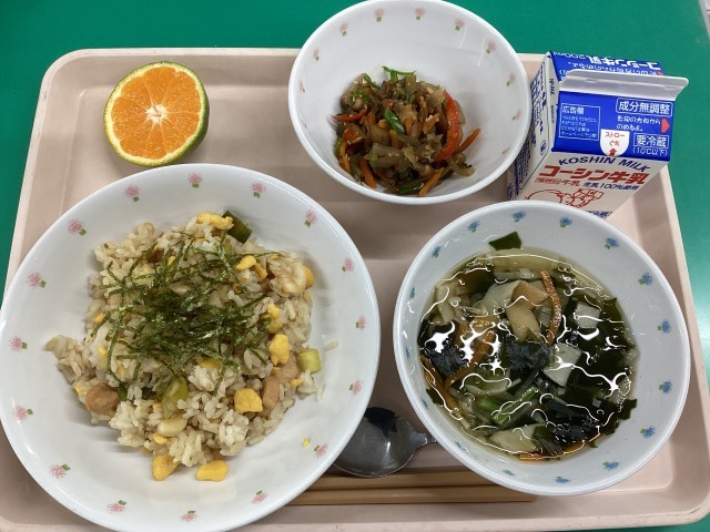 今日の献立焼き鳥ご飯、野菜のすまし汁、彩りきんぴら、菊花みかん、牛乳です。