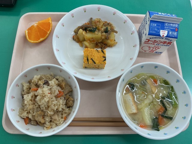 今日の献立濃い色ご飯、呉汁、卵焼き、じゃがいものそぼろ煮、デコポン、牛乳です。