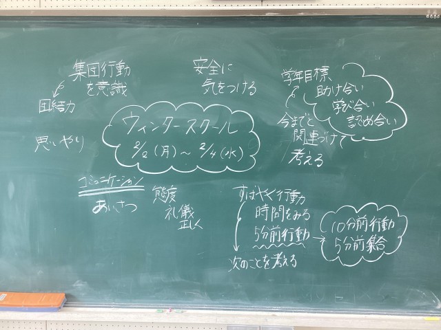 ウインタースクールに向けて、日程の確認を行い、どのような目標をもって当日を迎えるか学年全体で話し合いました。