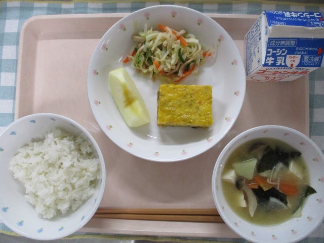 今日の給食は、かぼちゃ入りのたまご焼きでした。