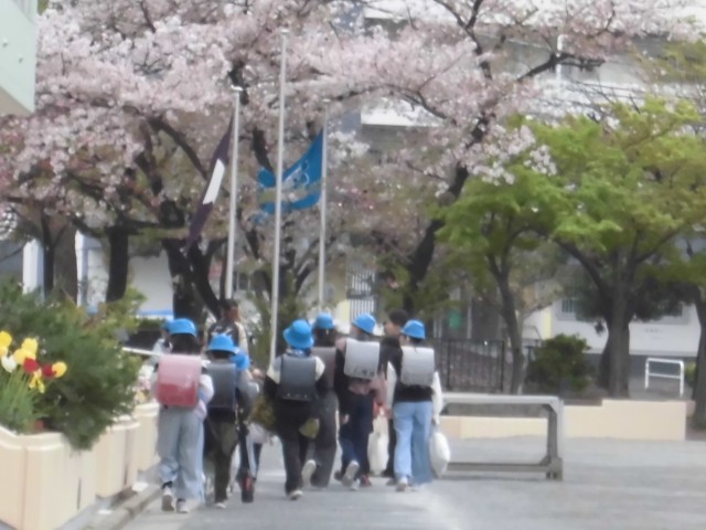 昨日の春の嵐のような風が収まり、今朝は青空が見えました。桜のアーチの下を通って子供たちが登校してきます。