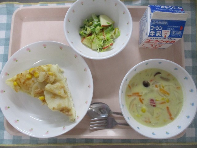 うきたの給食4.10 公開日 2026/04/13 更新日 2026/04/13 うきたの給食 今日の献立*てづくりパン(ツナポテトマヨ)*春キャベツとりんごのサラダ*コーンクリームスープ*牛乳今日は、給食室で生地から手作りするてづくりパンで、ふわふわでおいしく焼き上がりました。今日の給食の中で、子供たちに人気だったのが、春キャベツとりんごのサラダでした。 いいね(0)