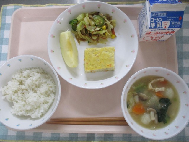 今日は、野菜などの具と、卵と豆腐とだしを混ぜ合わせて焼いて作る「ぎせい豆腐」でした。