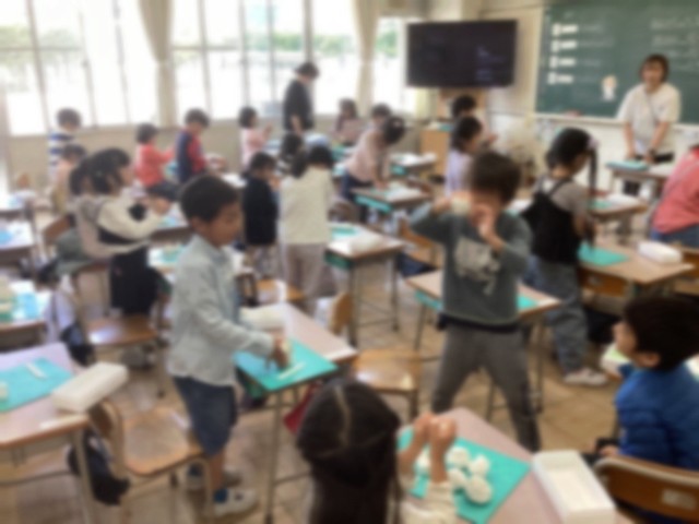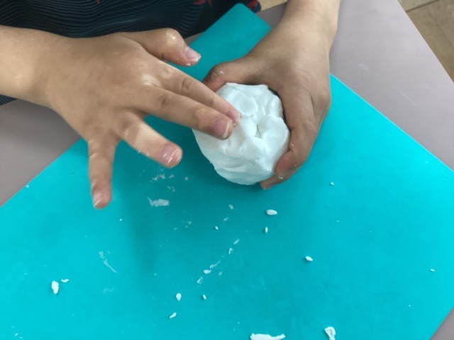 一つのかたまりになっていた粘土を分けて、小さな丸や細長いひもを作りました。