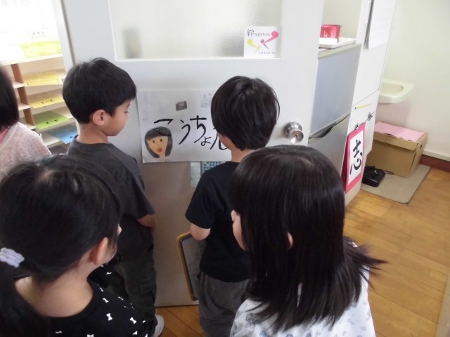 校長室のドアにはシールが。行った場所にやさしくシールをはってあげる2年生。