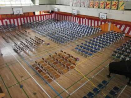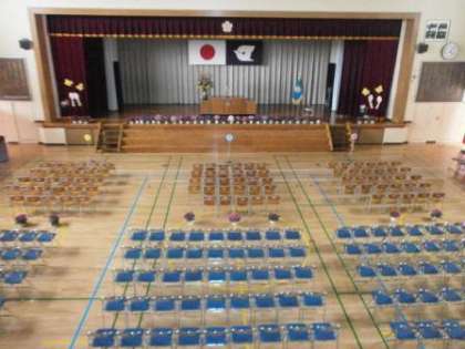 入学式の会場準備が完了しました。後は、明日を待つだけです。新一年生のみなさん、宇喜田小学校は、江戸川区で一番楽しい小学校を目指しています。