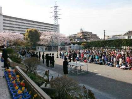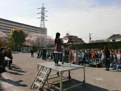 すみわたる空の下、森の桜が満開に咲き誇り校庭で明るい瞳に出会うことが出来ました。8時20分より校庭で平成28年度宇喜田小学校1学期始業式が始まりました。