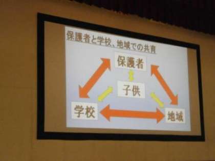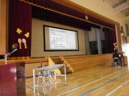 校長の経営方針を具現化するために『平成28年度 宇喜田小学校教育活動の特色』について、教務主幹、生活指導主幹、体育主任よりスクリーンを使って説明いたしました。