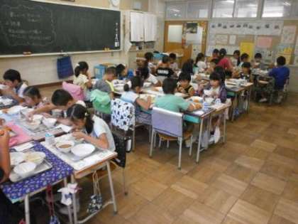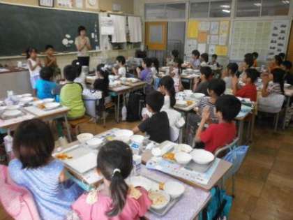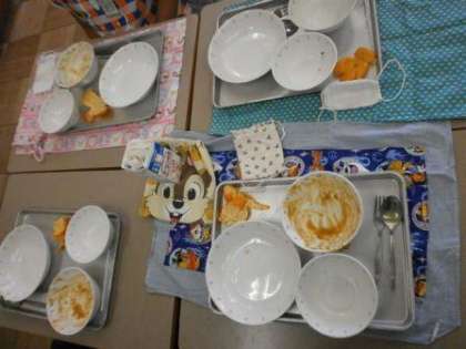 給食指導の時間、2年生、4年生の教室を訪問しました。どのクラスも笑顔で楽しそうに食事をしていました。