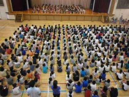 開始時間前に体育館に入ると児童が整列していました。2年生からは担任ではなく、整列係の児童が自分のクラスを整列させています。8時20分の開始前に全校児童が整列を終えました。司会進行は代表委員です。