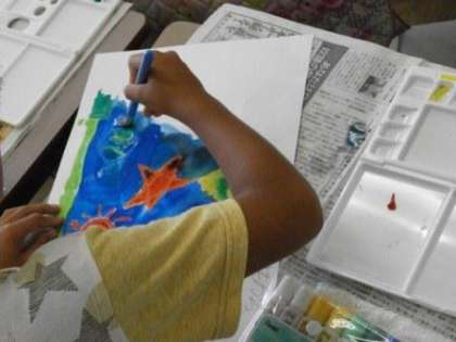 朝、声を掛けてくれた1年生の図工の授業を参観しました。色鉛筆、クレヨン、絵の具を使い自分の好きな図柄を表現してくれました。