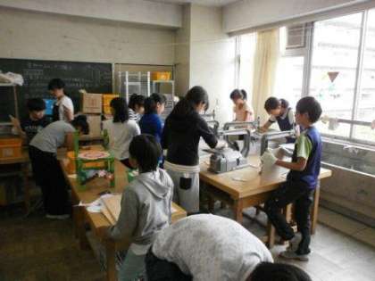 3時間目、図工室の防音扉を開けると、目の前に児童が円陣を組んでいるように見えました。担当の先生の声だけが聞こえて来ます。これから使用する糸鋸について丁寧に説明しています。児童の真剣な眼差しが先生を見つめます。みなさん集中しています。