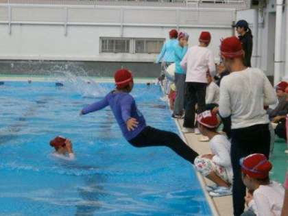 5年生は、着衣泳に挑戦しました。時折強い日差しが照りつける中、着衣泳が始まりました。水着で泳いだ後、シャツ、ズボン、靴を見に付け、着衣泳を行いました。泳ぎにくさを体験し、もしものことを想定しながらペットボトル浮き輪も実践しました。