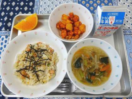 宇喜田小の子がみんなおいしく食べられる、サケ・しょうが・ねぎ・にんじん・のりを使った、少し変わり種のチャーハンです。食べやすさや、クーラーなどで少し冷えた体をあたためてくれることを考え、チャーハンの具を選んでくれたそうです。