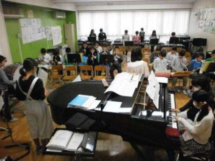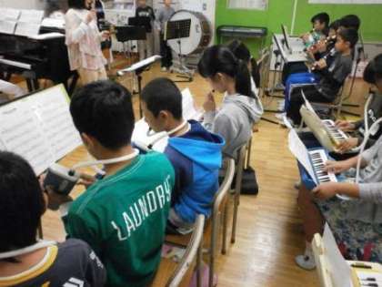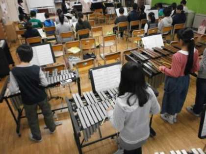 児童が、それぞれのパートに分かれて演奏しています。音楽室に気持の良い音色が広がっていました。打楽器、管楽器、様々な音色がパートごとの練習なのに澄んでいるんです。終わり5分前、全体での合奏が始まりました。