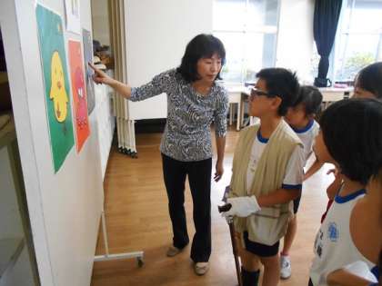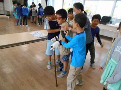 「もし80歳になったら」という体験で、色覚変化の体験のための眼鏡、前かがみになる荷重チョッキ、関節の動きを制限するサポーター、手袋…など様々な用具を装着しました。その状態で信号機の色や、ワイシャツのボタンを外す、椅子に座ったり立ったり等、普段は何気なくしている動作がとてもやりにくく、「全然見えないよ。」「つえがないと歩くのが難しい。」と戸惑いながら動いていました。
