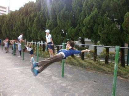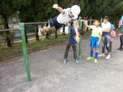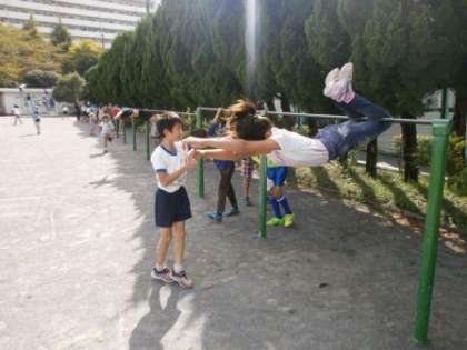 さくら公園から戻ると中休みのチャイムがなっていました。校庭に児童が飛び出してきました。その勢いからなのか、鉄棒から飛び出す児童を発見しました。