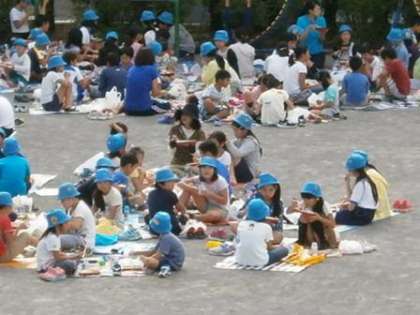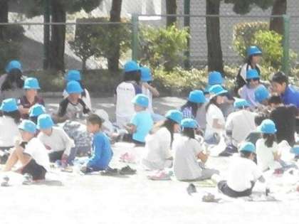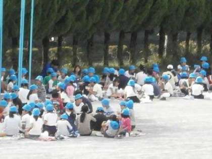 今日は、『青空給食』です。校庭になかよし班が広がりました。