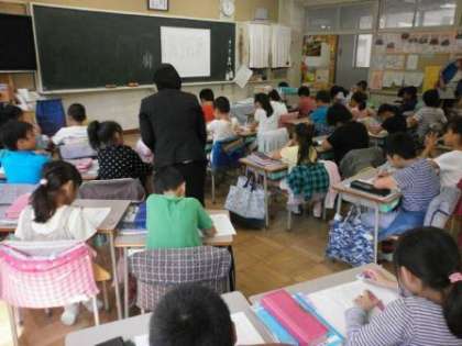 2年生の国語、図工、算数の授業を参観しました。どのクラスも集中して授業に参加していました。算数では、かけ算の学習に入っていました。ランドセルの棚からヒントを得て発表している児童がいました。