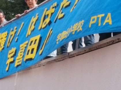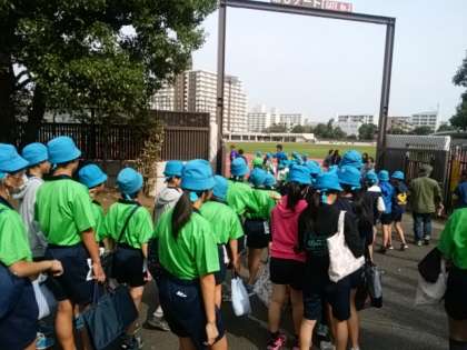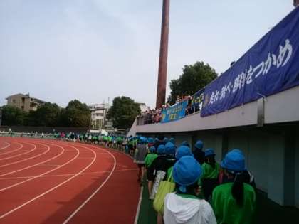 いよいよ、江戸川区陸上競技場に入場します。保護者の皆さんの応援旗を確認できました。