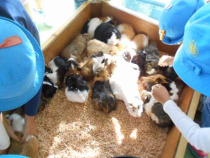 また、ふれあいコーナーでは、モルモットを膝の上で抱いたり、ウサギやヤギ、ヒツジ、鶏(シャモ)に触れたりしました。