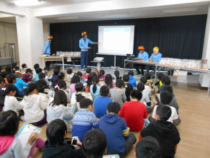 今日は、愛媛県のミカン農家の方をお招きして、ミカンの栽培から収穫、出荷までのお話を聞き、そのあとミカンの収穫体験をしました。