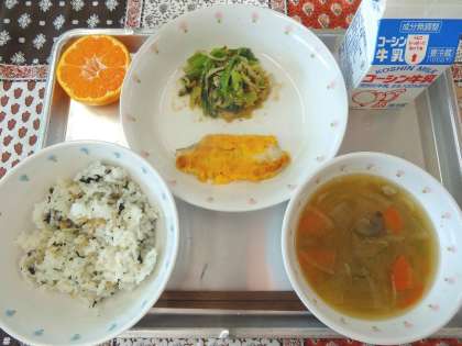 今日の給食の「タラのもみじやき」は、すりおろしたにんじんをまぜ、塩コショウで味をととのえたマヨネーズを、冬においしい魚・タラに塗って焼いたものです。最近、とても寒くなってきて、木々もきれいに色づき始めていますが、今日の「もみじ焼き」も、もみじのような鮮やかな色合いがなんとも秋らしいですよね。