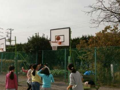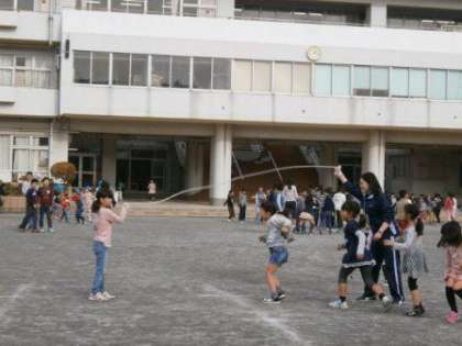 午後1時、チャイムと共に児童が校庭に飛び出しました。これから昼休みが始まります。20分間、校庭、遊具、森の中で様々な遊びを生み出します。学生ボランティアと大縄をしている児童をみつけました。