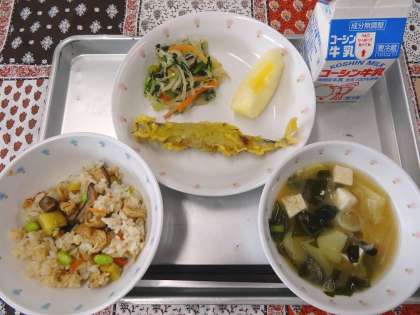 今日の給食の「ふきよせごはん」は、たくさんの具が入っていて、色とりどりな見た目もおいしそうなごはんです。