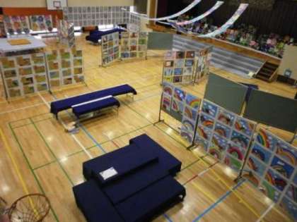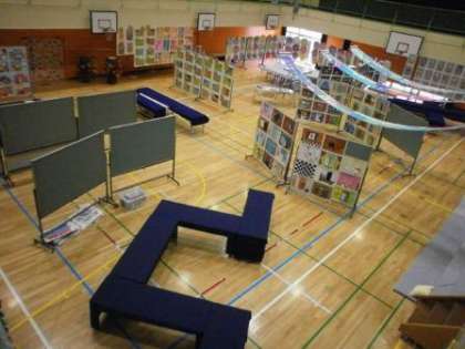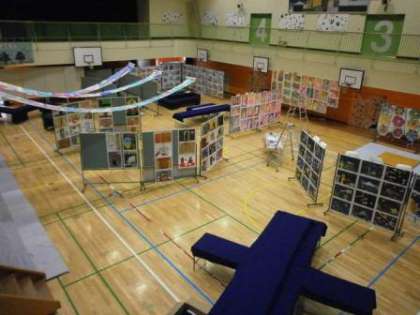 いよいよ明日から展覧会です。先生方の準備にも力が入ります。今朝、体育館をのぞいてみました。昨日の放課後、或いは今朝はやく準備したのでしょうか、展示物が整理され始めました。