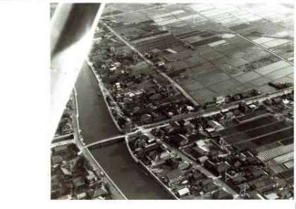 昭和38年1月22日午後2時、新渡橋上空より撮影。宇喜田小学校にある鉄塔が右上にかすかに見えます。一面『たんぼ』です。
